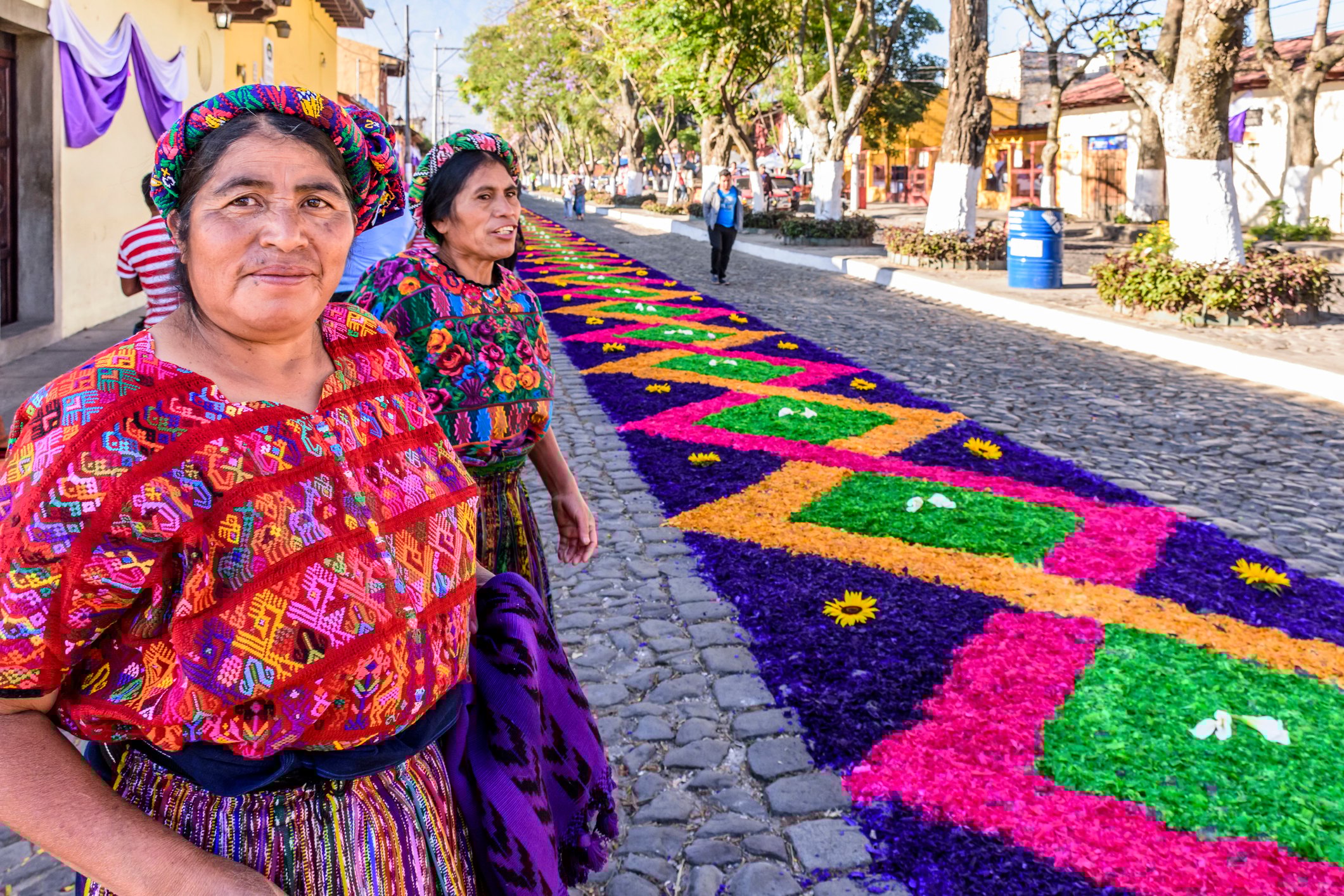 Long before sunrise, families gather to create alfombras—intricate carpets made from colored sawdust, flowers, pine needles, and natural materials.